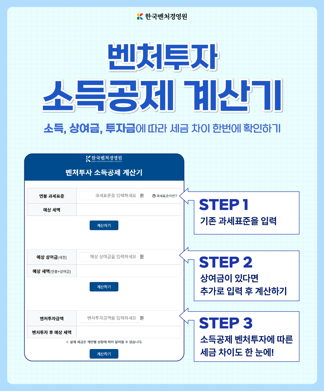 본 계산기는 연봉·상여금 및 벤처투자 금액을 기준으로 예상 세액과 소득공제 효과를 간편하게 산출할 수 있도록 구성되어 있으니